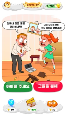 "도와주세요 : 까다로운 두뇌 퍼즐" 속 수백 가지의 논리 퍼즐과 기상천외한 수수께끼는 당신의 한계를 시험할 것입니다. 탐정처럼 단서를 찾아내고, 판사처럼 상황을 분석하며, 비판적 사고력을 발휘하여 모든 도전을 극복하세요. 쉬운 조작법과 시선을 사로잡는 그래픽은 게임에 몰입하는 즐거움을 더해주며, 예상치 못한 반전으로 가득한 시나리오는 끊임없이 당신의 두뇌를 자극합니다. 정형화된 틀을 벗어나 자유로운 사고를 펼치고, 궁극의 브레인 티저를 통해 자신만의 해답을 찾아내는 짜릿함을 경험해보세요.