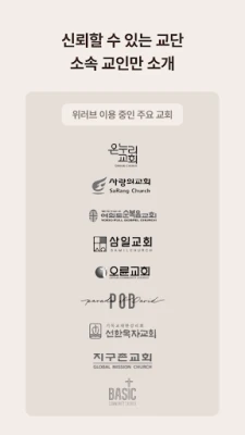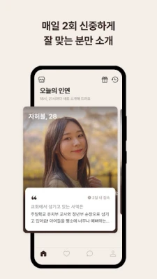 위러브는 단순한 소개를 넘어, 내면의 깊이까지 탐색하는 특별한 연결을 제공합니다. 신앙 고백부터 삶의 방식, 직업관, 취미에 이르기까지 총 43가지의 세심한 질문을 통해 당신 자신을 온전히 표현하고, 상대방의 가치관을 미리 헤아릴 수 있습니다. 무분별한 프로필 노출 대신, 매일 저녁 신중하게 선별된 인연 두 명을 제안하여 성급하지 않고 의미 있는 관계를 시작하도록 돕습니다. 출석 교회 정보는 서로가 연결된 후에만 공유되어 부담 없는 탐색을 가능하게 합니다.